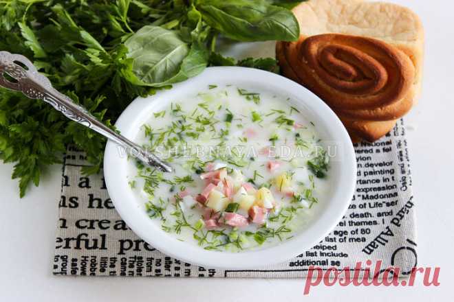 Окрошка с колбасой на майонезе и сметане.