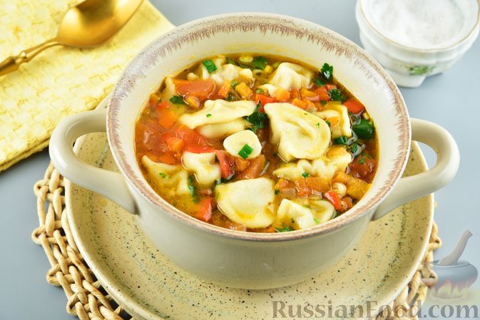 Пряный суп с пельменями, помидорами и сладким перцем. Оригинальный суп с пельменями, овощами и специями. Хороший вариант для быстрого обеда.