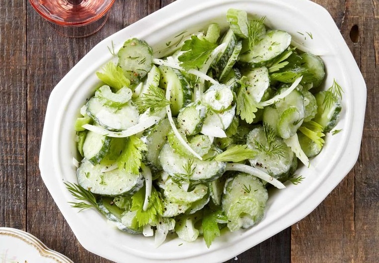 Салат из огурцов и сельдерея Этот хрустящий салат со сметанно-лимонной заправкой - идеальный летний гарнир. Ингредиенты: 3 ст. л. сметаны, 3 ст. л. оливкового масла, 3 ст. л. лимонного сока, Небольшой пучок свежего укропа,