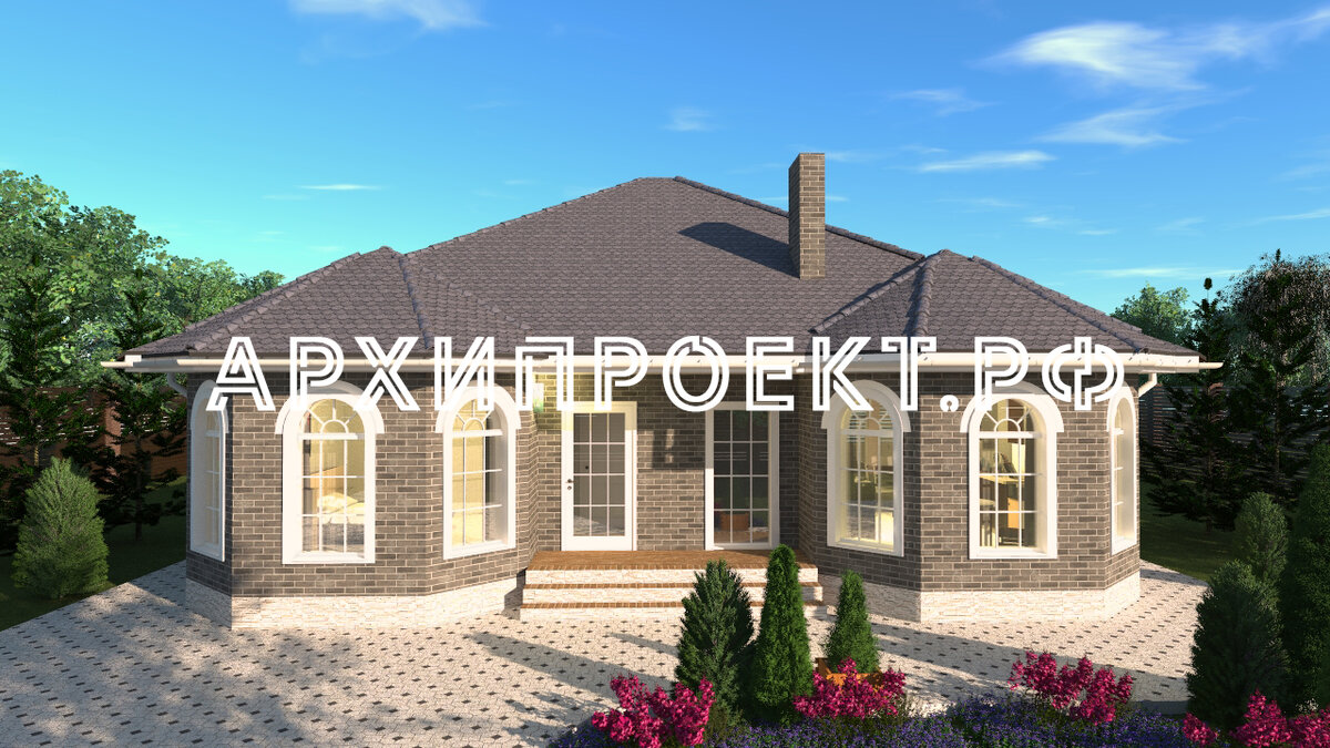 Симметричный одноэтажный дом из серого кирпича с полукруглыми окнами, проект №33 с площадью 112 кв м