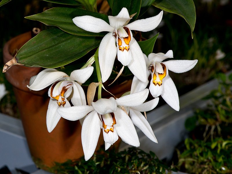 Орхидеи рода Целоргина (Coelogyne) | Садовник и Огородник Целоргины - небольшие орхидеи со стеблями от цилиндрических и округлых до плоских дискообразных форм. Листья парные, редко одиночные, ланцетные или линейные. Окраска цветков белая, серебристо-белая, желтоватая, зеленоватая или светло-коричневая, часто с коричневым рисунком. Цветки единичные или в многоцветковых поникающих кистях.