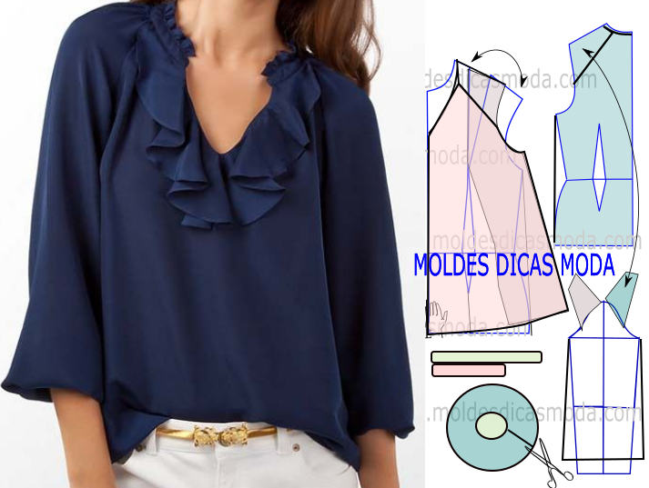 MOLDE BLUSA AZUL -81 | Moldes Dicas Moda O trabalho que proponho hoje tem o propósito de clarificar a transformação do molde blusa azul que vai com certeza fazer as delícias de muitos seguidores. Para fazer este modelo imprima o molde base de blusa e faça a gradação para o seu tamanho. Depois de obter o molde base…
