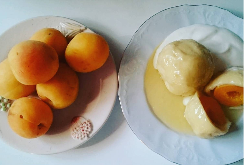 Кнедлики с абрикосами 250 г творог домашний (жирный и сухой) 1 шт яйцо 2 ст.л. манная крупа 1 ст.л. панировочные сухари По вкусу Соль По вкусу корица По количеству кнедликов -абрикосы 2 ст.л. сахарная пудра