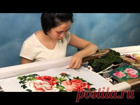 Вьетнамская девушка с ручной вышивкой - пион с вышивкой цветами и листьями