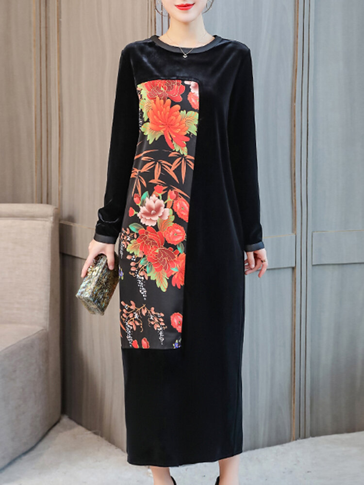 Hot saleЦветочный принт пэчворк Бархат с длинным рукавом Винтаж Платье Cheap - NewChic