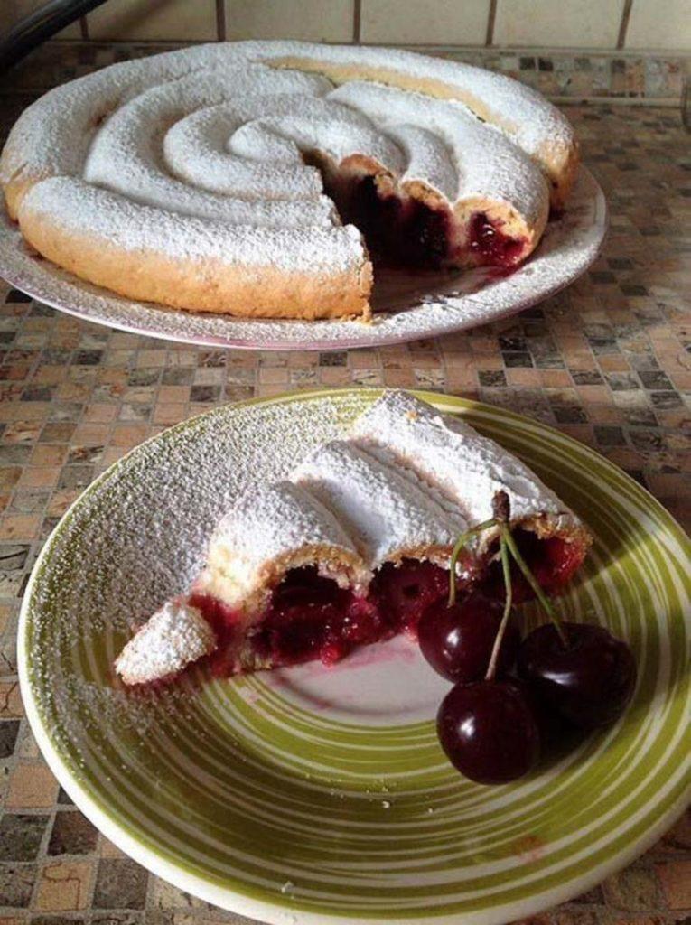 500 г вишни без косточек, 3 ст муки и 1 ст кефира для самого вкусного в мире вишневого пирога 'Улитка'