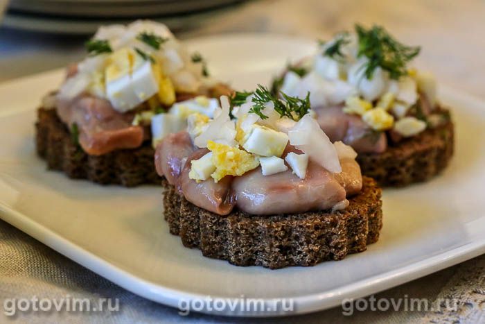 - И в завершении посыпать тартинки с молоками сельди и яйцом маринованным луком. Всё! Закуска на черном хлебе с молоками сельди готова. Приятного аппетита!