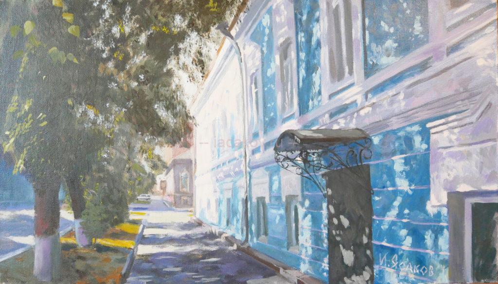 Бывшая усадьба Давыдовского - Официальный сайт художника Игоря Ясакова В Тюмени на пересечении улиц Володарского и Семакова стоит старое здание. Это бывшая усадьба Н.И.Давыдовского мецената и почетного горожанина. Сегодня здесь располагается медицинское учреждение. На картине показан не главный фасад, а возможно, чёрный вход. Им, скорее всего, пользовалась прислуга. Но это только моё предположение. Рядом высокие деревья, которые летом дают спасительную прохладу. Холст/масло 50х70 см