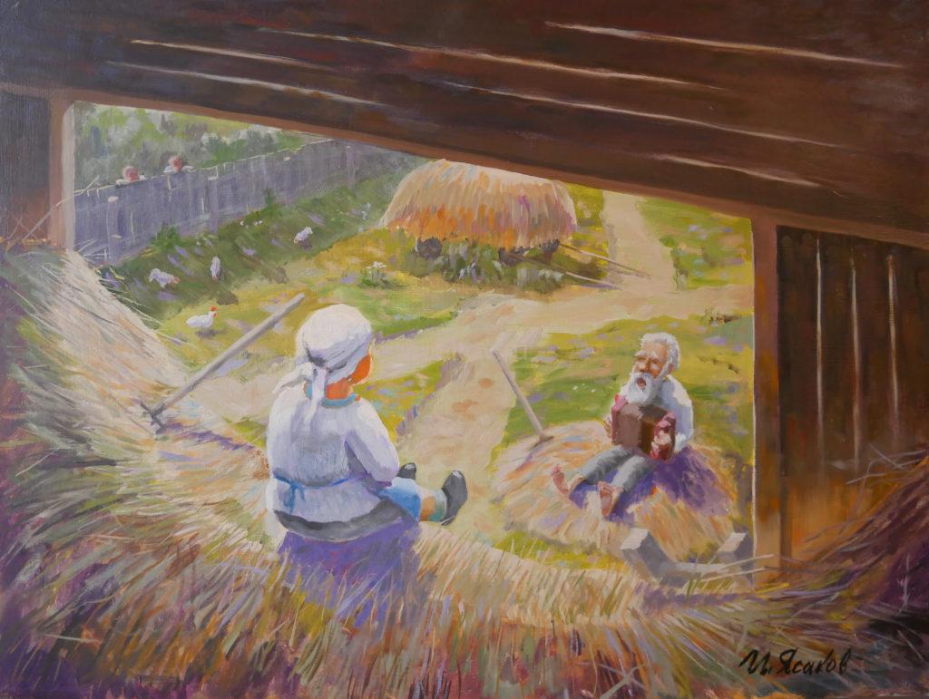 Серенада на сеновале - Официальный сайт художника Игоря Ясакова Баба на сеновале раскладывает сено, которое снизу подаёт её дед. Поработали, решили немного отдохнуть. Дед взял гармошку и запел любимую песню своей ненаглядной. Они прожили долгую нелёгкую, но счастливую совместную жизнь и не растратили тёплых чувств друг к другу. Сохранили свою любовь. Во дворе гуляют куры. Из-за забора на деда с бабкой смотрят внучата. Слушают, …