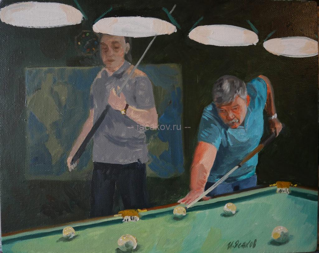 55-й - Официальный сайт художника Игоря Ясакова Русский бильярд. Двое игроков. Один из них забивает шар с номером 55. Это работа сделана к юбилею друга. Холст/масло 40х50 см.