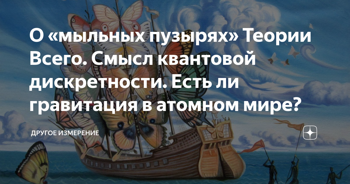 О «мыльных пузырях» Теории Всего. Смысл квантовой дискретности. Есть ли гравитация в атомном мире? С тех пор, как в начале 20-го века квантовая механика (КМ) и теория относительности (ТО) прочно обосновались на научном «Олимпе», физики не прекращают предпринимать попытки объединить их в Единую Теорию Всего. В последние годы напридумано множество гипотез, претендующих на роль такой супер-Теории, начиная от струнно-петлевых тем, заканчивая Квантовой Теорией Гравитации (КТГ).