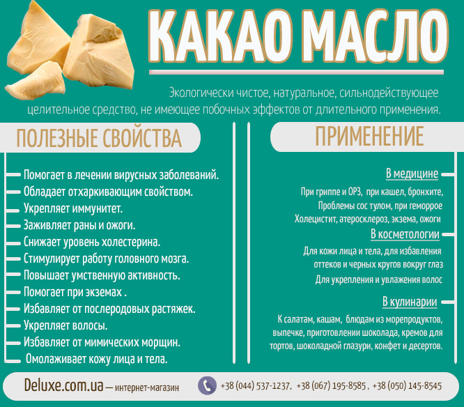 Масло какао — полезные свойства, применение, рецепты. Инфографика