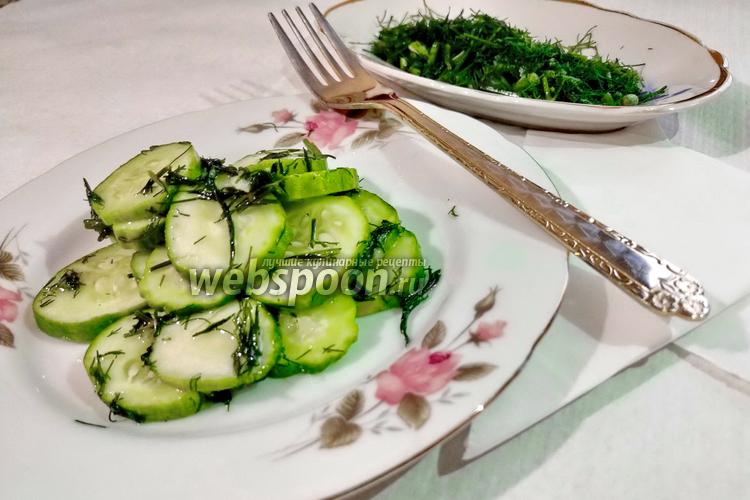 Летний освежающий салат из огурцов и укропа, заправленный чесноком и подсолнечным маслом.