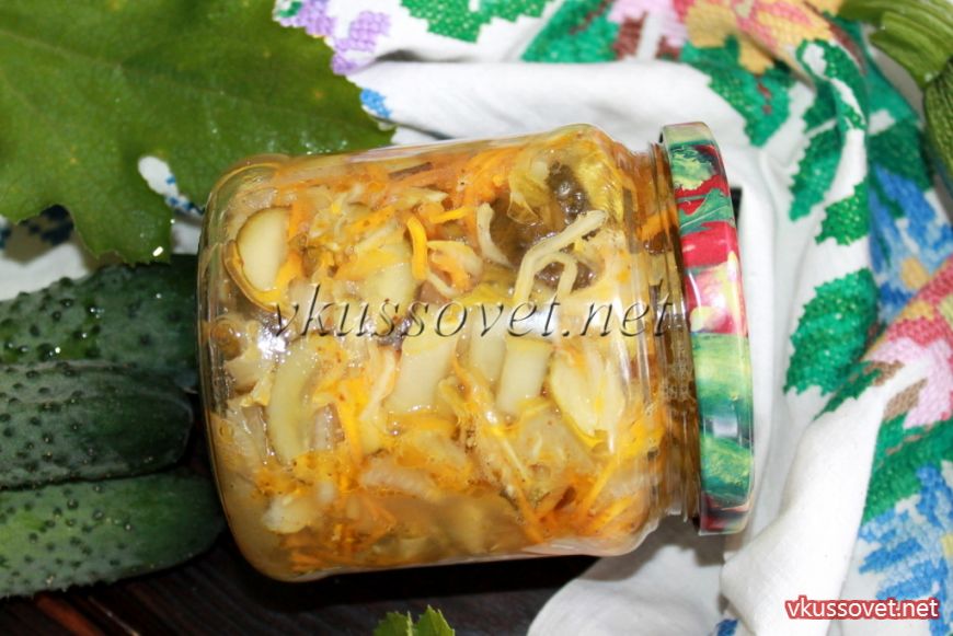 Салат из огурцов с кабачками на зиму Летний период – благодатное время для заготовок. Салат из огурцов с кабачками на зиму выручит, когда гости на пороге. Блюдо полностью готово к употреблению. Его можно взять с собой на пикник или выложить в красивую тарелку и подать на праздничный стол. Вкусно полакомиться овощной смесью за семейным