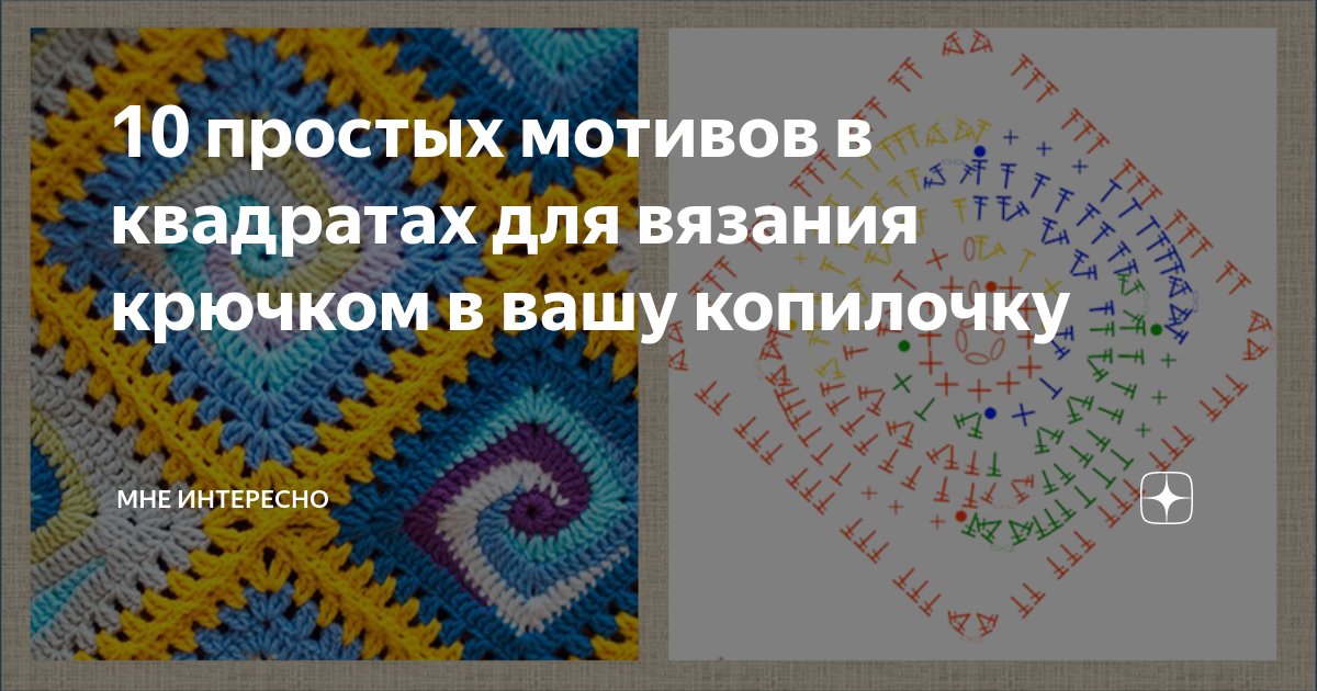 10 простых мотивов в квадратах для вязания крючком в вашу копилочку Вязание на основе простого бабушкиного квадрата не дает покоя мастерицам всего мира. Сегодня у меня для вас интересные мотивы для вязания крючком. Они квадратные и похожи на бабушкин квадрат, но все же отличаются от стандартных схем. Смотрите, вдохновляйтесь, забирайте в свои копилочки