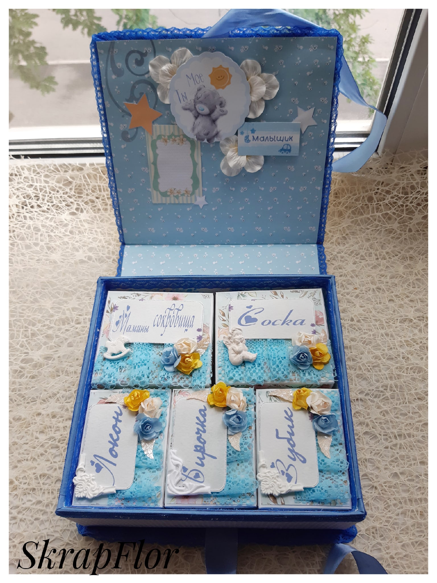 Мамины сокровища для мальчика. Размером 20,5 на 22 см. Крышка маминых сокровищ мягкая - синтепух, обтянута тканью. В коробочке есть маленькие коробочки под :мамины сокровища , бирку, зубик и локон.