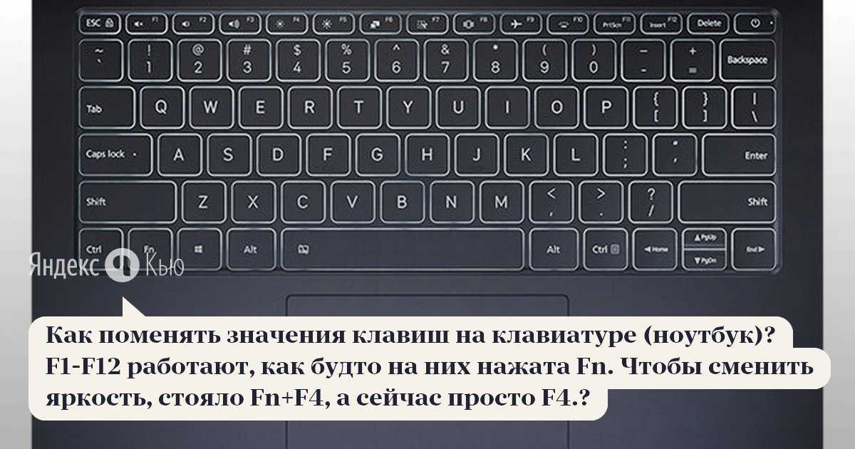 «Как поменять значения клавиш на клавиатуре (ноутбук)? F1-F12 работают, как будто на них нажата Fn. Чтобы сменить яркость, стояло Fn+F4, а сейчас просто F4.?» – Яндекс.Кью 06 июля 2018 Никита Ярунин ответил: Fn + Esc Я вообще чуть из-за этой проблемы не снес винду пару лет назад :) Так что бывает и такое) Успехов, мой друг, просто мне нужно 140 символов.
