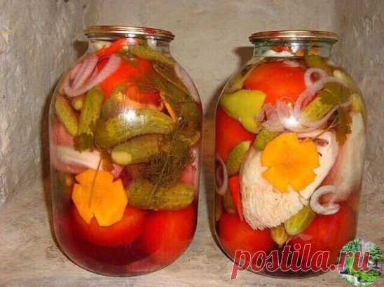 "Пряное ассорти" В банку положить специи. Душистый горошек, лавр. лист, перец горошком, гвоздику,зелень,чеснок. Помидоры режу на 2 - 4 части, в зависимости от размера. В банку складываю помидоры, лук кольцами, листья петрушки,базилик,чеснок,морковь,перец болгарский.Первый раз заливаю кипятком на 20 минут. Второй раз заливаю маринадом: на 1 литр воды - 1 стол. ложка соли, 2 стол. ложки сахара, 80гр. уксуса 9%. В банку залить столько ложек растительного масла, на сколько литров банка: в 1 литрову
