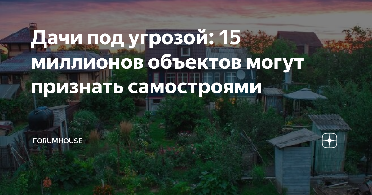 Дачи под угрозой: 15 миллионов объектов могут признать самостроями Садоводы опасаются, что их участки не будут зарегистрированы, а строения снесут. Дачи и огороды сотен тысяч российских граждан, по мнению Людмилы Голосовой, председателя профсоюза садоводов России, находятся под угрозой. Она считает, что отмена дачной амнистии и сопутствующие законы способны поставить крест на беззаботной жизни многих дачников. Источник фото: Яндекс.Картинки Чиновник отмечает
