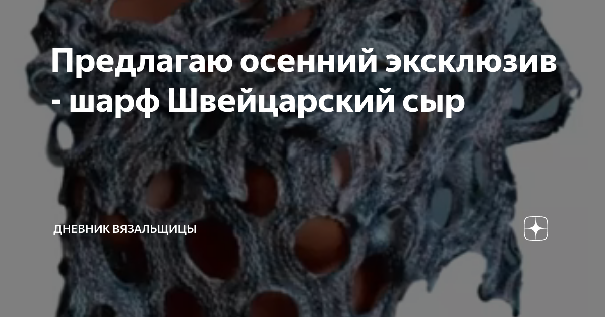 Предлагаю осенний эксклюзив - шарф Швейцарский сыр Связала я когда-то шарфик, модель которого очень нравится. Называется он "Швейцарский сыр". Правда, свой шарф я называю "Сыр с плесенью" из-за цвета пряжи. Вяжется он очень просто, есть схема вязания.