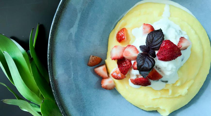Кукурузная каша со страчателлой, клубникой и халвой