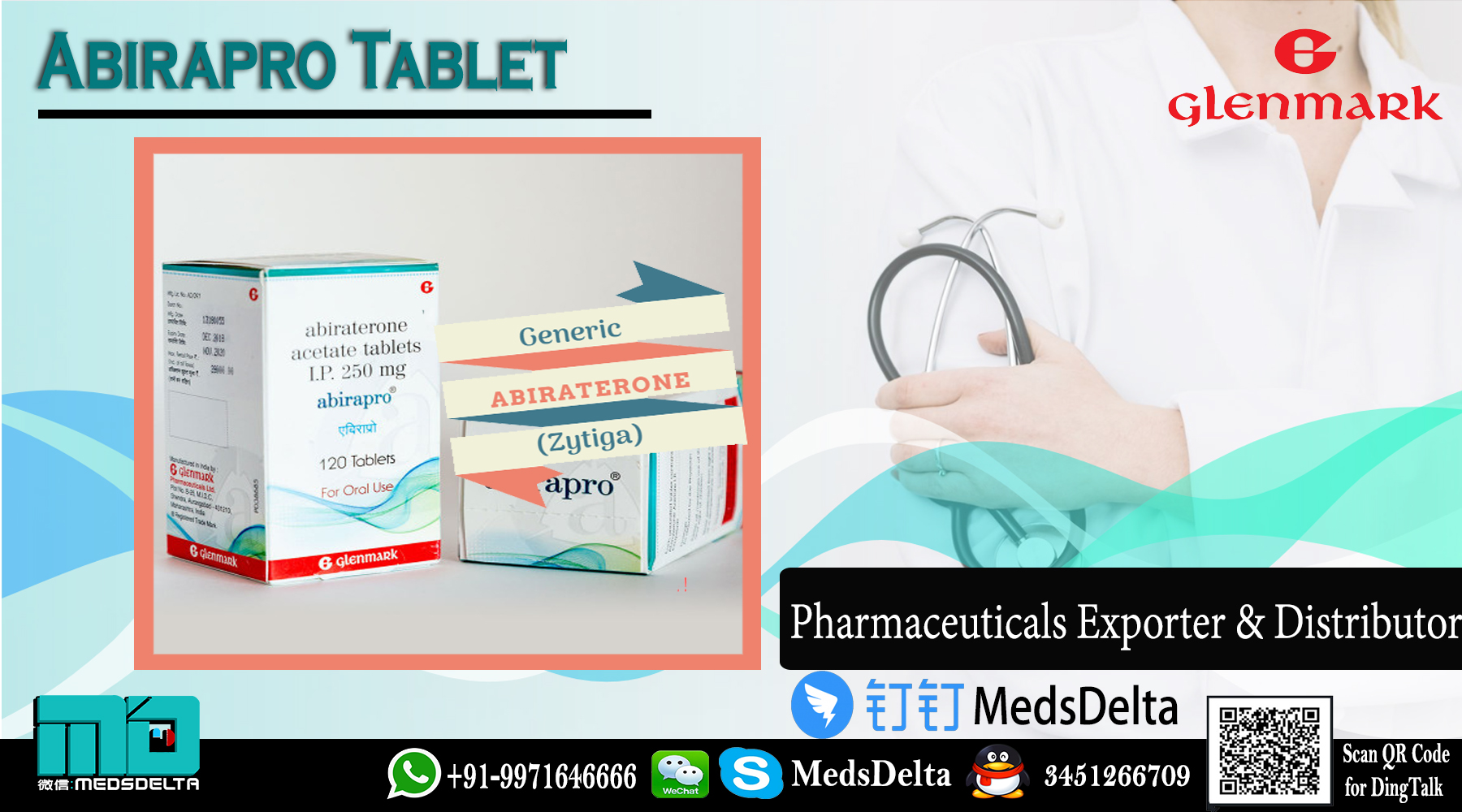 Buy now Abirapro Tablet made by Glenmark from MedsDelta at discounted prices. Abirapro Tablet Abiraterone acetate comes as Generic Zytiga available online in India. Learn more about the Abirapro 250mg/500mg from MedsDelta Call/WhatsApp: +91–9971646666, QQ: 3451266709, WeChat or Skype: MedsDelta, DingTalk: MedsDelta. Get Abirpro online with delivery to Austria, Bahrain, Bangladesh, Belgium, Bhutan, Canada, Denmark, Finland, France, Germany, Hungry.