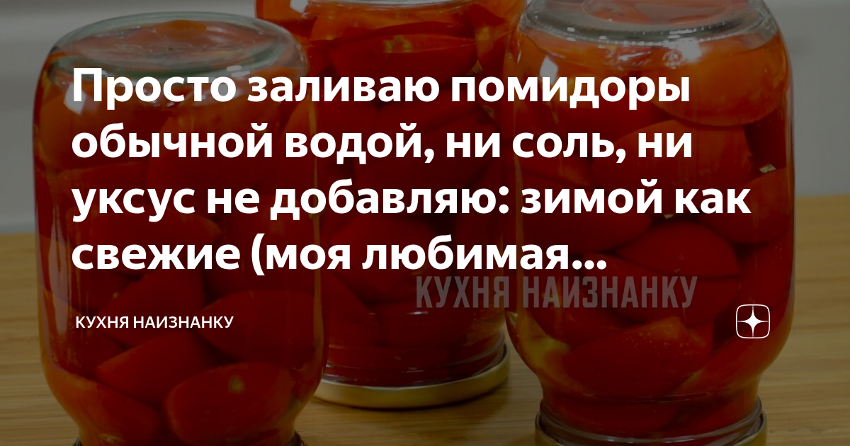 Просто заливаю помидоры обычной водой, ни соль, ни уксус не добавляю: зимой как свежие (моя любимая заготовка на зиму)
