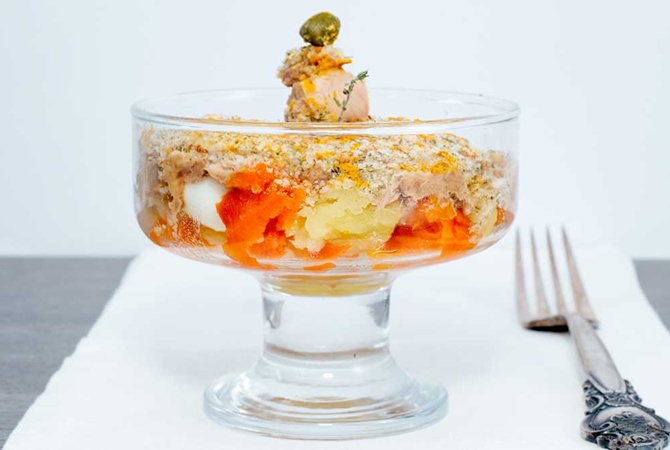 Как традиционный салат "Мимоза" сделать по-новому: с копченой сайрой, тунцом и брюшками лосося