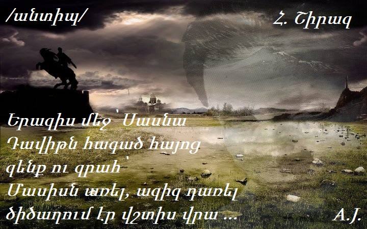 Երազիս մեջ՝ Սասնա Դավիթն հագած հայոց զենք ու զրահ՝Մասիսն առել, ազիզ դառել՝ ծիծաղում էր վշտիս վրա .../անտիպ/Հ. Շիրազ