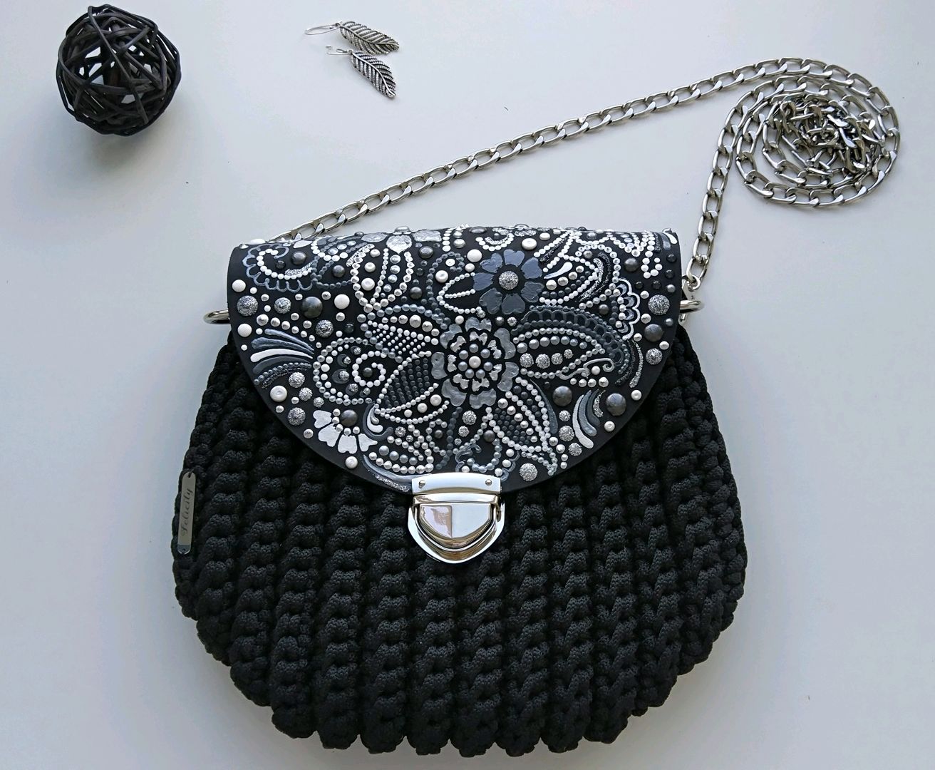 Черная сумка-ракушка с авторской росписью на клапане – заказать на Ярмарке Мастеров – LUEOGRU | Классическая сумка, Рыбинск Черная сумка-ракушка с авторской росписью на клапане в интернет-магазине на Ярмарке Мастеров. Сумка выполнена из полиэфирного шнура черного цвета.