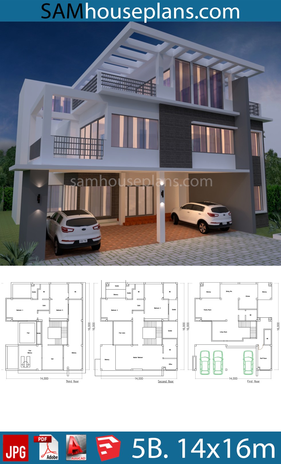 House Plan 14x16m with 5 Bedrooms - SamHousePlans