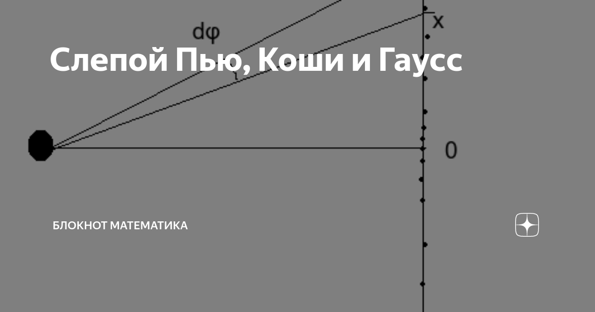 Слепой Пью, Коши и Гаусс Заметка в стиле серии про Сильвера, но относится к серии "Принцип невероятности". Однажды слепому Пью показалось, что он окружен солдатами короля, и он стал стрелять во все стороны, равновероятно выбирая угол от 90 градусов влево до 90 градусов вправо. В 20 ярдах от него был забор, очень длинный. В него и попадали пули. Нас интересует распределение пуль, попавших в доски...