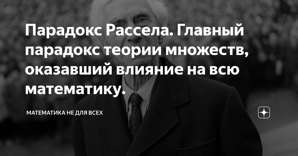 Парадокс Рассела. Главный парадокс теории множеств, оказавший влияние на всю математику. Идет 1902 год, немецкий философ, а заодно логик и математик, Фридрих Людвиг Готлоб Фреге терпеливо трудится над вторым томом "Основных законов арифметики". И вот, когда основная работа подходит к концу, к нему приходит письмо от другого мастодонта логики - англичанина Бертрана Рассела. Прочитав это письмо, Фреге вносит примечание в своё произведение, которое начинается с таких слов: "Вряд ли с