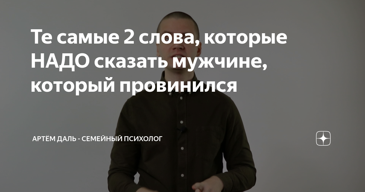 Те самые 2 слова, которые НАДО сказать мужчине, который провинился В жизни и отношениях возникают различные ситуации, и бывают и такие, в которых мужчина виноват. И в этой статье я поговорю о критичных случаях, а не о небольших ошибках, когда мужчина может исправиться. Я расскажу о случаях, когда мужчина изменил, ударил, предал, и совершил подобные действия, которые требуют только одной реакции... Артём Даль - Семейный психолог Итак, что же это за загадочные два