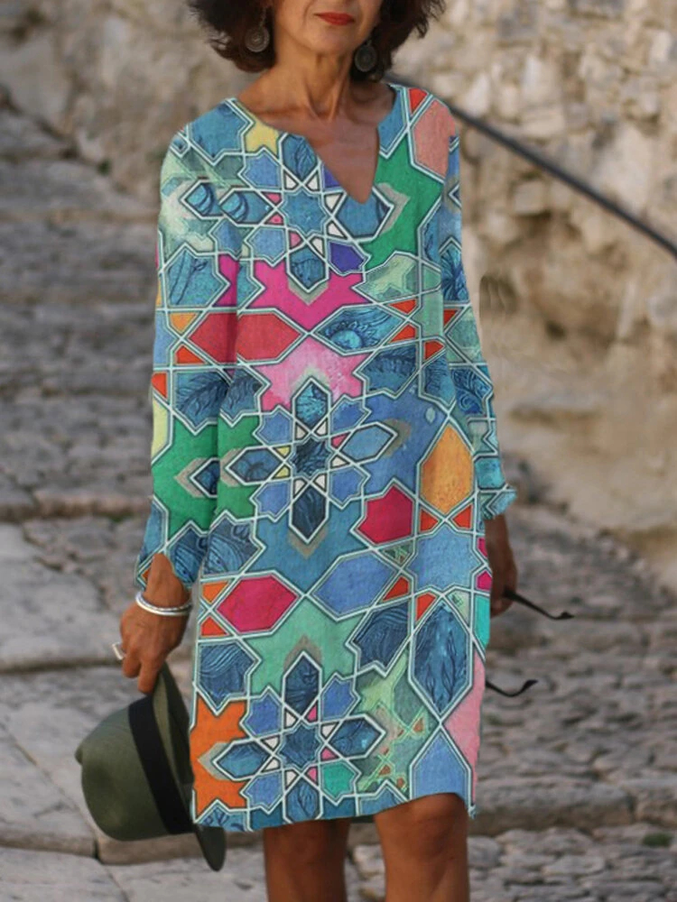 Colorful Geometric Print V-neck Long Sleeve Daily Casual Midi Dress - US$16.99