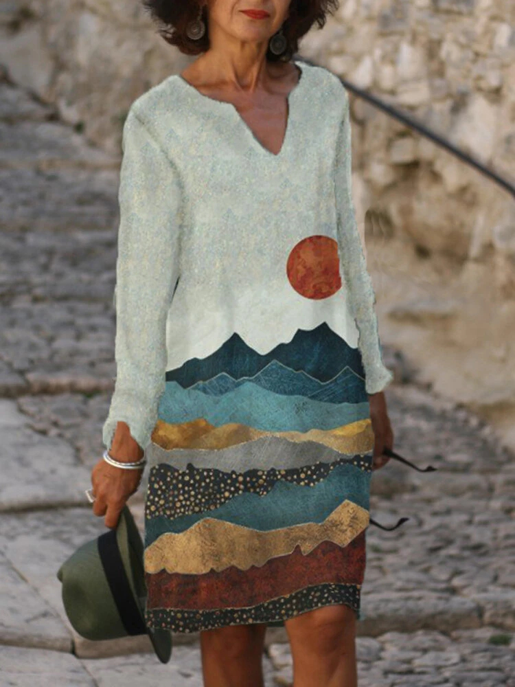Vintage Floral Printed V-Neckline Long Sleeves Casual Dresses - US$16.99