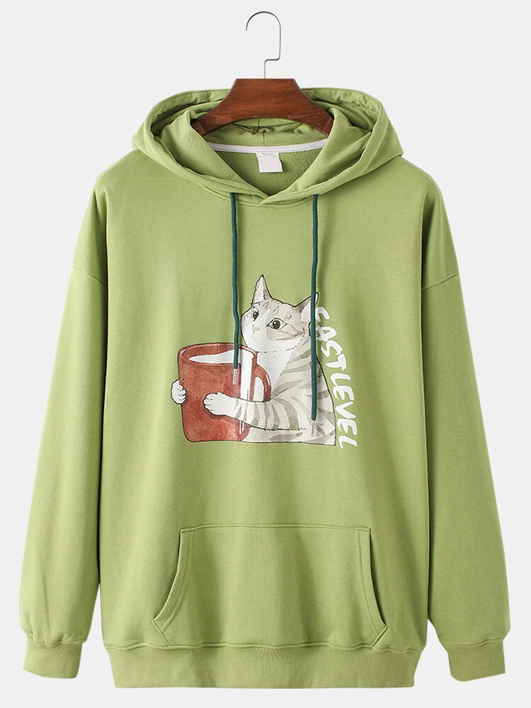 Mens Cartoon Cat Print Drop Sleeve Casual Loose Fit Kangaroo Pocket Hoodies - US$39.99