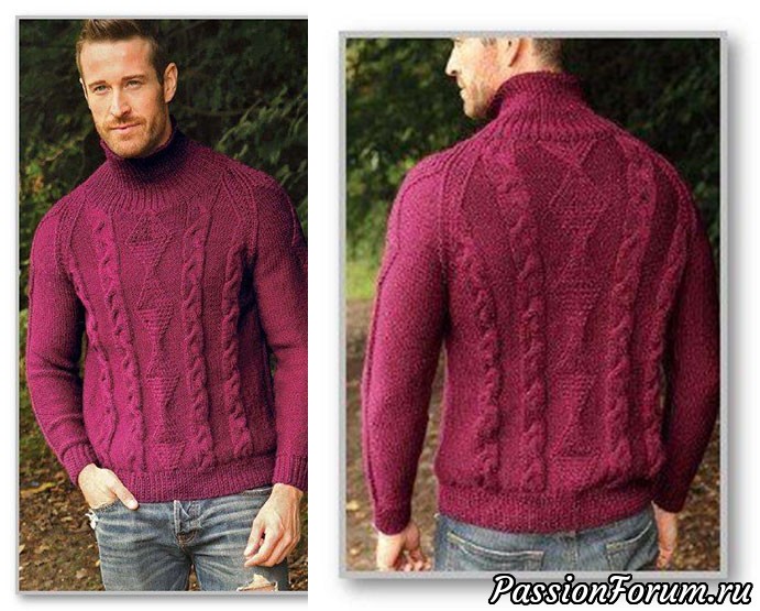 Бордовый мужской пуловер с рукавами-реглан и крупным рельефным узором спицами. Размер от 42-44 до 66-68