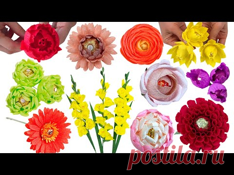11 идей цветов для осенних букетов из конфет. Цветы из гофрированной бумаги. Подарки и поделки.