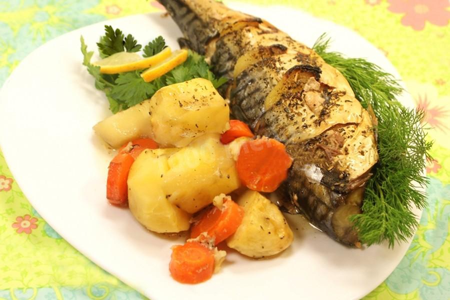- 1. Макрель потрошим, вычищаем черную пенку внутри, отрезаем голову и плавники. С одной стороны на кожице делаем несколько глубоких надрезов ножом. 2. Тушку снаружи и внутри натираем солью, а также сухими специями для рыбы, сбрызгиваем оливковым маслом, поливаем лимонным соком, в брюшко выкладываем веточку розмарина. 3. Лук репчатый очищаем, разрезаем пополам, а затем режем пластинками, которые вставляем в надрезы на тушке макрели. 4. Картофель и морковь очищаем, моем, режем кусочками крупно, затем посыпаем солью и перцем, поливаем оливковым маслом, выкладываем в рукав для запекания. 5. Подготовленную тушку макрели выкладываем в рукав к овощам, закрепляем рукав, на одной стороне рукава делаем проколы иглой для выхода пара. 6. Оставляем рыбу с овощами в таком положении в течение часа, после чего отправляем в духовку разогретую до 200 градусов и запекаем в течение получаса. Подаем на стол сразу же после приготовления, по желанию можно украсить зеленью. Приятного аппетита!