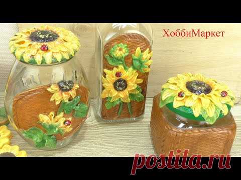 Украшаем банки и бутылки. Красота для кухни. Подсолнухи. ХоббиМаркет
