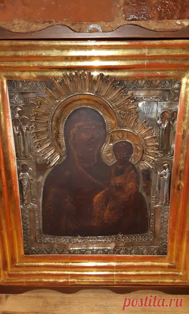 Смоленская Пресвятая Богородица с предстоящими князьями Ярославскими : Фёдором и Давидом и Ангел хранителем : Евгенией. 19 век. Российская Империя. Оклад Серебро 84 проба Ярославские клейма. Киот родной. Реставрация. 500 х 450 х 105 мм. Витрина киота : 432 х 372 мм. Рама. Покрыта сусальным золотом. Размер : 455 х 403 мм. Оклад. Серебро. 84 проба. 1822 год. Клейма на торце и на венцах. Икона с клеймами Ярославля. Венцы покрыты позолотой. Икона : кипарисовая доска. Темпера....
