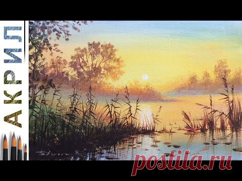 Летний закат на озере. Как нарисовать пейзаж🎨АКРИЛ! Сезон 6-5 | Мастер-класс ДЕМО