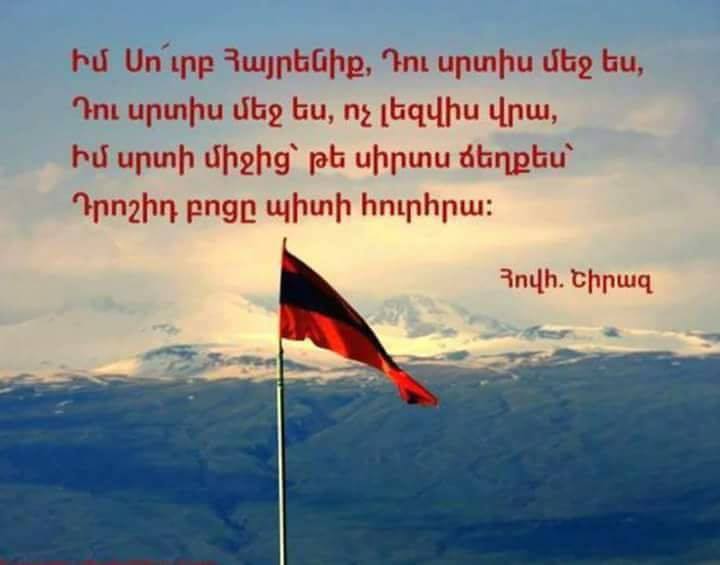 Տոնդ շնորհավոր հայրենիք, տոնդ շնորհավոր ազատ, անկախ Հայաստան, տոնդ շնորհավոր հայրենակից: Մեծն Շիրազը կասեր՝