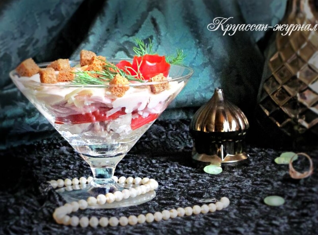 Ржаные сухарики, ветчина, курица, пармезан – эти ингредиенты делают салат сытным, поэтому он вполне может выступать в качестве ужина или самостоятельной закуски на праздничном столе. «Фишка» салата – соус на основе майонеза с чесноком, укропом и аджикой, что придаёт блюду остроту и пикантность.