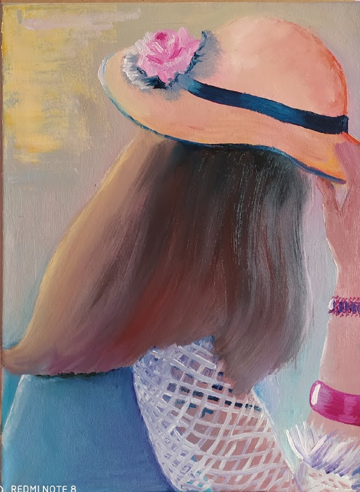 Девушка в шляпке. Написана в 2020 году, интуитивная живопись ( правополушарная живопись). Пока рисовала ее, не могла оторваться.Да, здесь все простенько, но что-то в ней есть)
