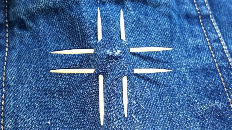 Как зашить дырку с помощью 4 зубочисток На джинсах или любой другой плотной ткани образовалась дырка, а заплатку ставить не хочется? Воспользуйтесь этим простейшим лайфхаком, как красиво зашить ткань с помощью 4 зубочисток (или швейных иголок). Получается молниеносный и очень красивый декор!