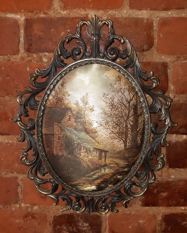 Картина. Дом. Шелкография, пейзаж в ажурной латунной раме. Винтаж. 70 годы 20 век.