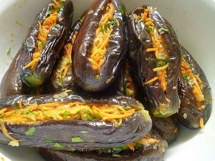 #заготовки Фаршированные баклажаны на зиму Надёжный рецепт! Баклажаны – 10 шт. Перец – 3 шт. Морковь – 2 шт. Чеснок – 3 головки Петрушка – 1 пучок Для маринада: Вода-1 литр Соль– 2,5 ст.л. Сахар – 2,5 ст.л. Уксус 9 %– 3 ст.л. Растительное масло – 5 ст.л. Душистый перец горошек – 10 шт. Лавровый лист – 3 шт. Морковь натереть на тёрке. Перец нарезать тонкой соломкой. Чеснок пропустить через пресс. Петрушку порубить. Тщательно смешать все подготовленные ингредиенты и остав...