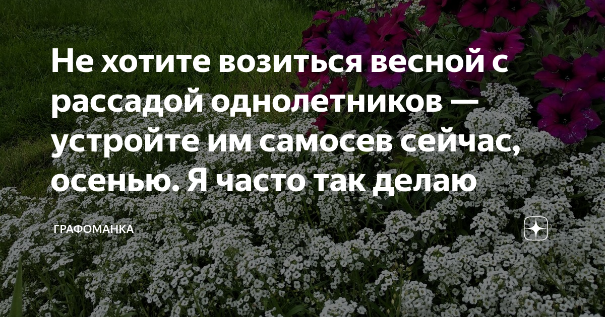 Не хотите возиться весной с рассадой однолетников — устройте им самосев сейчас, осенью. Я часто так делаю Думаю, никому не надо подробно объяснять, что такое самосев. Цветы цветут, семена созревают и осыпаются на землю. Весной следующего года на этом месте (и не только) появляется густая поросль. Всходят семена, осыпавшиеся с цветов прошлым летом. У меня в разные годы отлично вырастали самосевом эшшольция, ромашка, календула, алиссум, космея, василек. Хорошо, если это совп...